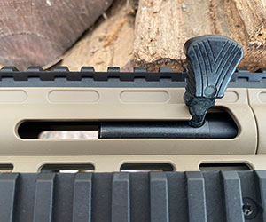 Two tactical carryovers that clearly set this rifle apart from others in the same price range are the HK-style slappable charging handle and the fully ambidextrous, gigantic fire selector switch. The fully-reversable handguard-mounted charging handle sits well in front of the chamber and is a ton of fun to slap to close the bolt on mag changes. It’s almost worth practicing mag changes more often just to play with it. And the fire selector has an enormous switch with big F and S lettering so there is no doubt when the safety is on or off.